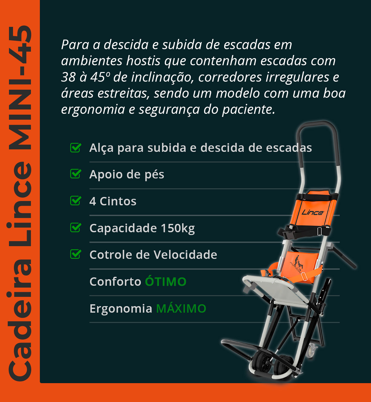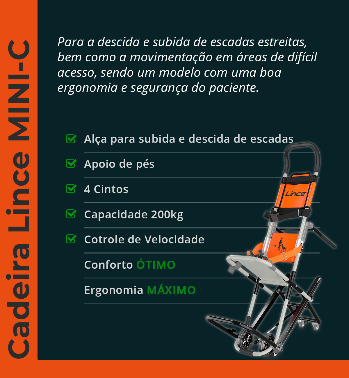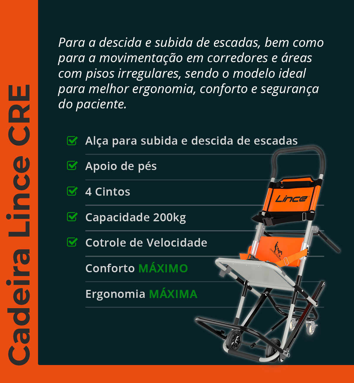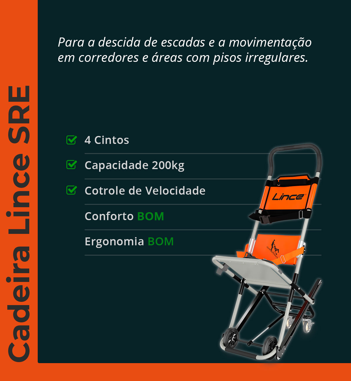 Bombeiro"A cadeira Lince, é um produto inovador e essencial para emergências. Sua capacidade de descer escadas com eficiência, agilidade e segurança é impressionante, proporcionando um transporte rápido e seguro de pacientes, mesmo em ambientes mais desafiadores. Uma solução diferenciada que garante a segurança e a mobilidade necessária em momentos críticos."